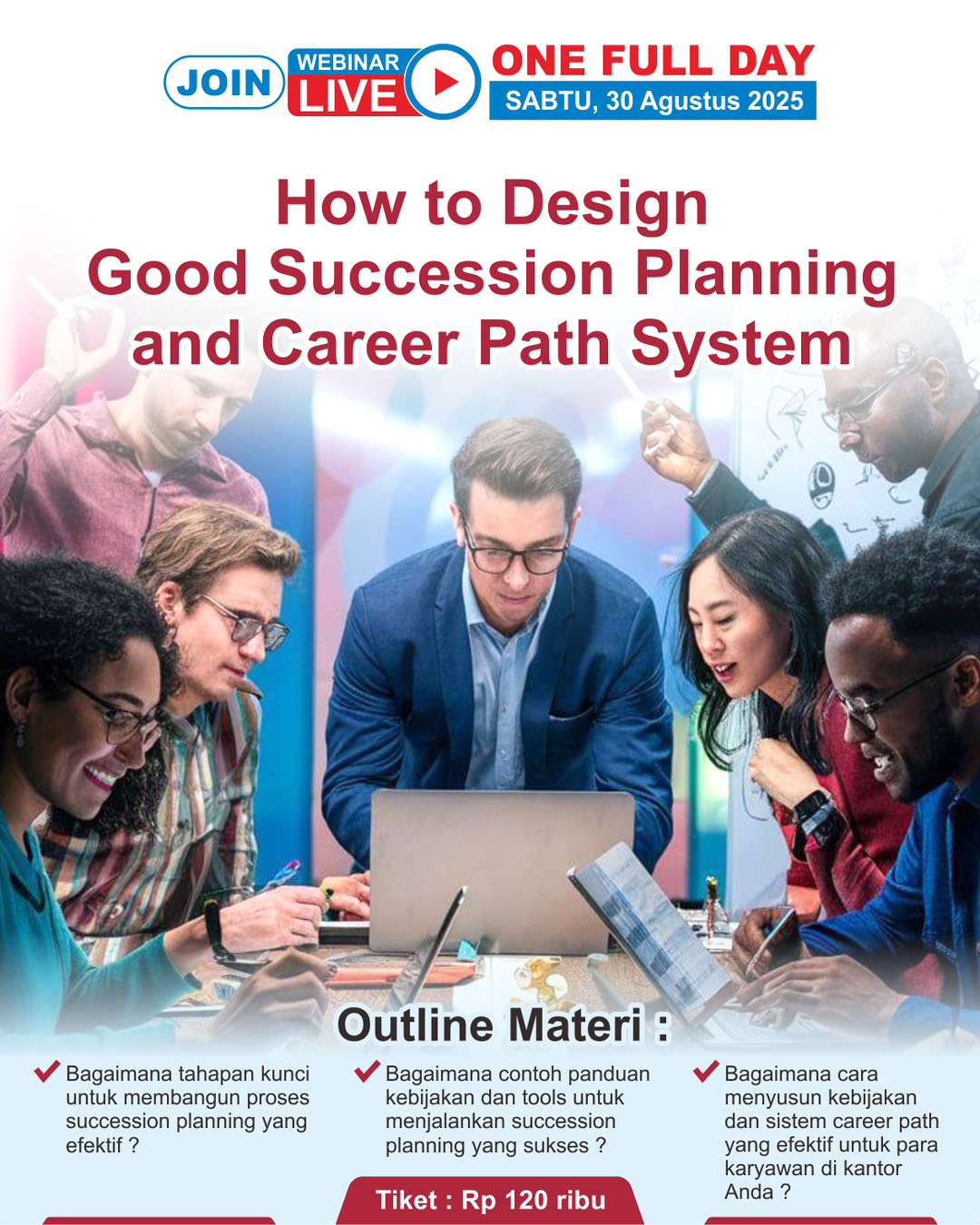 Ikuti LIVE WEBINAR dengan topik How to Design Good Succession Planning and Career Path System, yang akan saya deliver pada hari Sabtu, tanggal 30 Agustus 2025 jam 09.00 – 16.00 wib (one full day webinar!!)